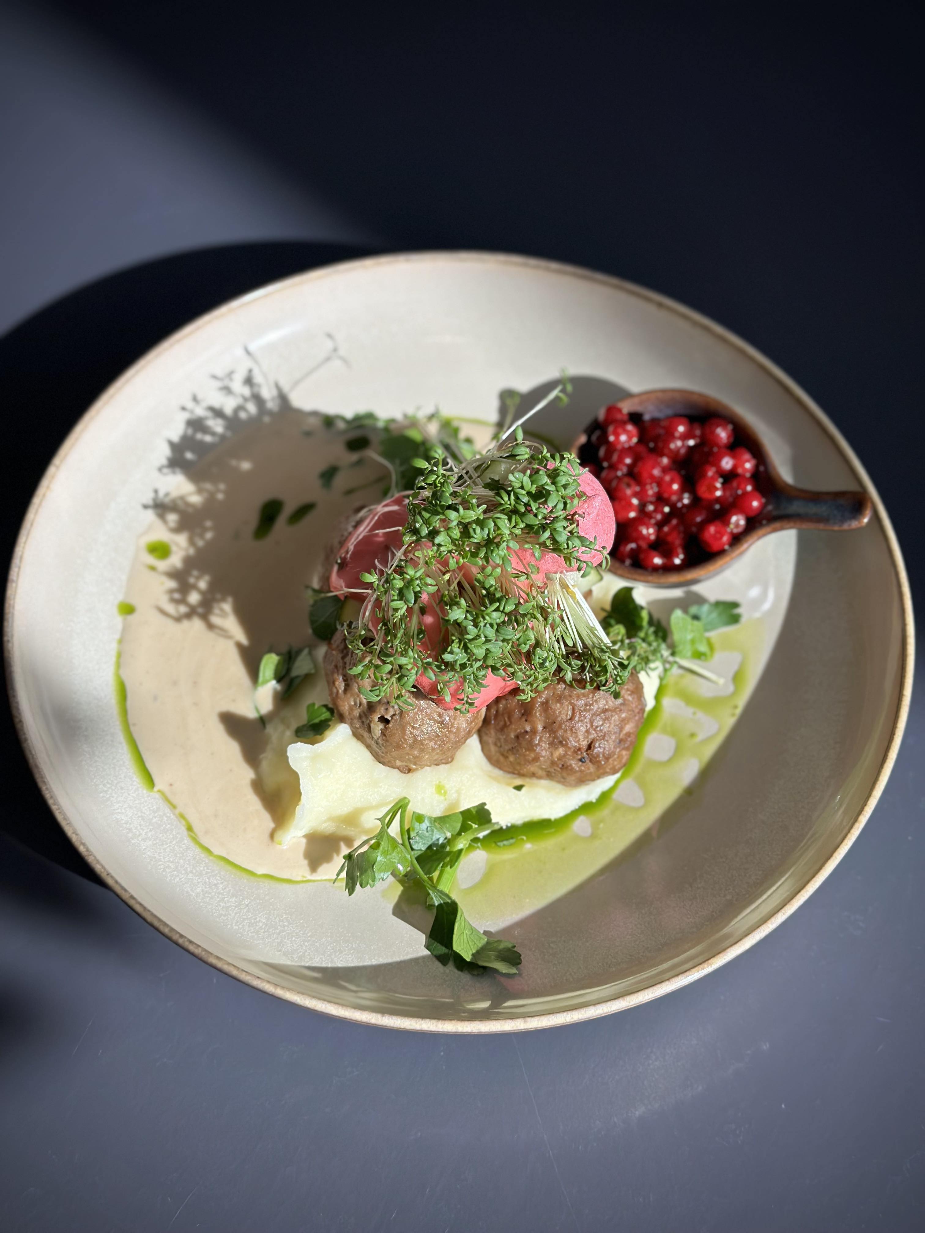 Wallenbergare med potatis purré, lingon och brynt smör.