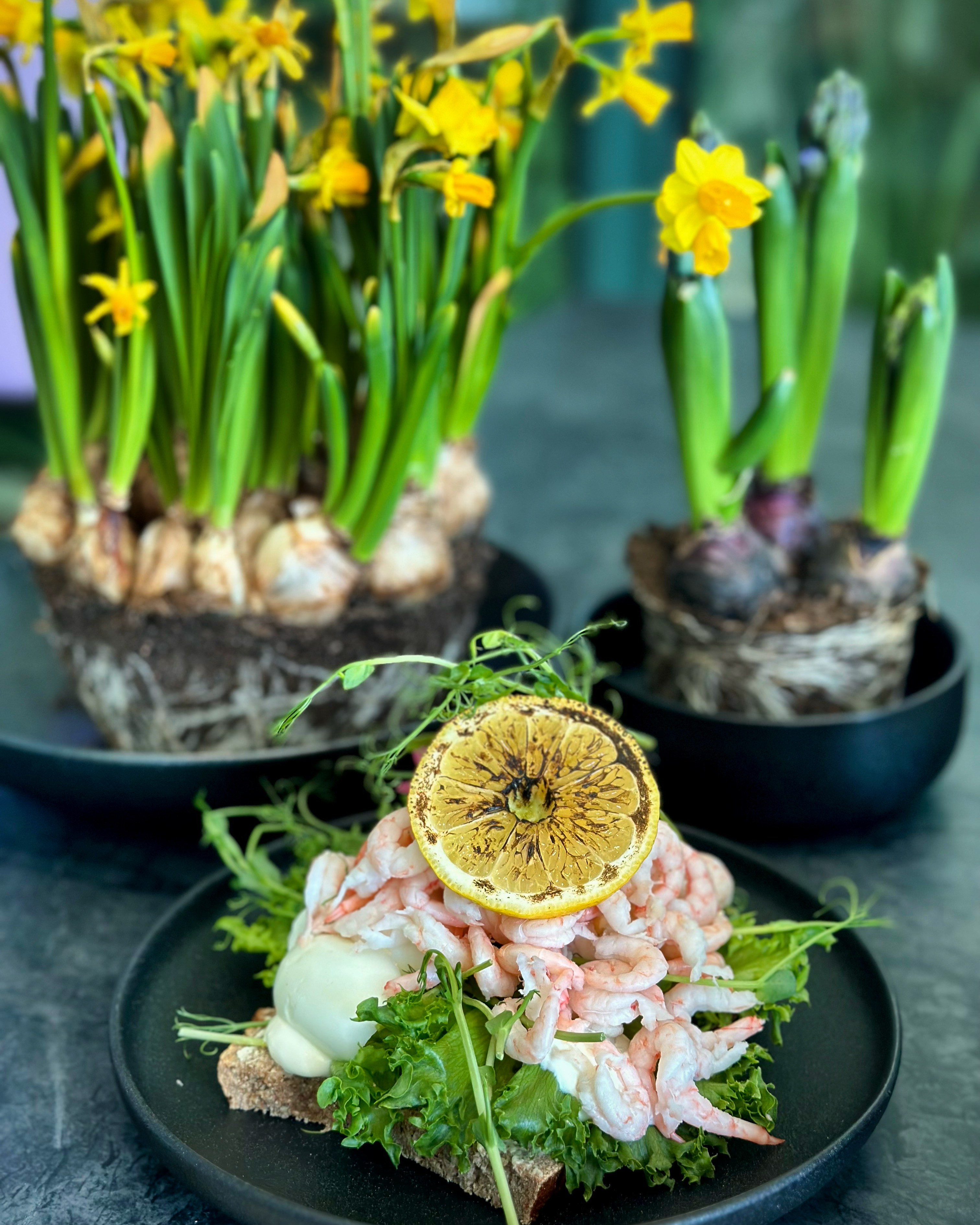 149 - 245 krPå vårt egna surdegsbröd med handskalade räkor, picklad rödlök, citron & dillolja. LF